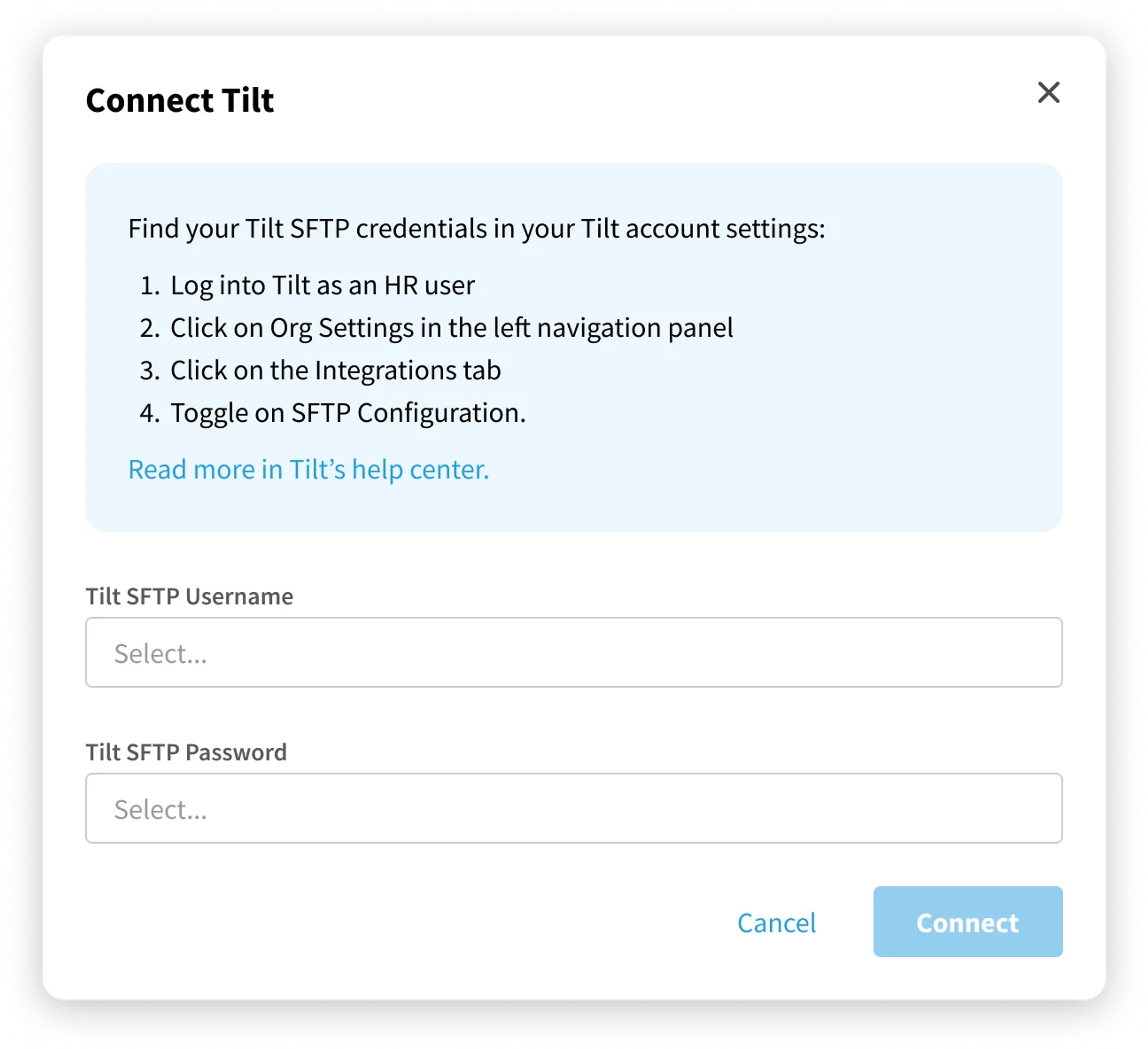 After giving permission, On the next page we'll ask you to enter your Tilt SFTP credentials. Tilt offers help article for this step.