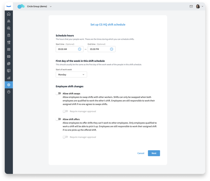 After enabling shift scheduling for a location, You’ll see options to set the schedule hours, week start, and employee shift change rules.