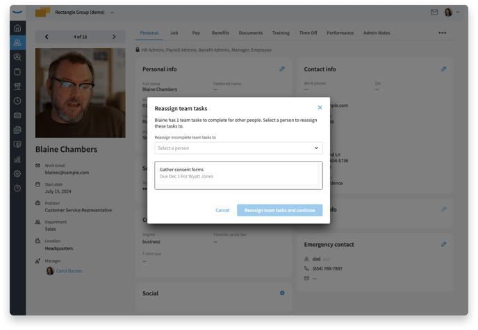 If the employee had been assign tasks that they needed to complete on behalf of others (like signing a document), you'll have the chance to re-assign these tasks to a different employee.