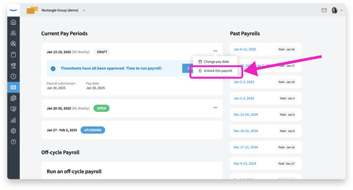 A payroll admin can unlock a payroll to allow for edits. To unlock the payroll click the 3-dot menu on the payroll card and select the option to Unlock this payroll.