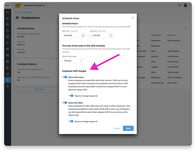 Turn on shift swaps and shift offers so employees can trade or give up shifts while you keep control over who is allowed to work each one.