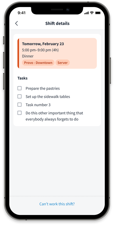 When shift swaps are enabled, employees can request to trade one of their assigned shifts with another worker who is qualified to work it. The employee opens the Scheduling view (on desktop or in the mobile app) and selects a shift they’re currently assigned to. The shift will have a link Can't work this shift? that will bring up the swap or offer options.