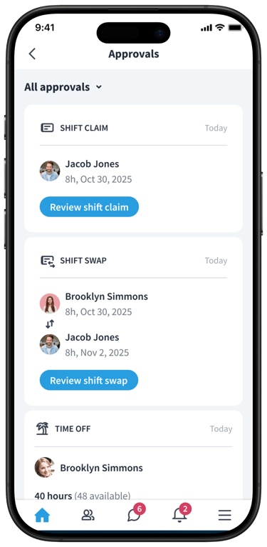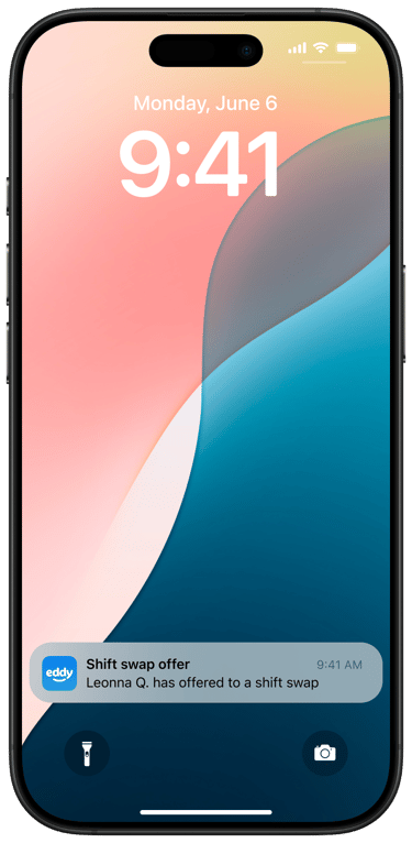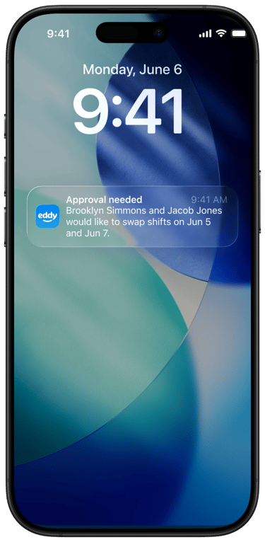 If you require manager approval for swaps, managers review and finalize changes before the schedule is updated. The manager gets a notification. In addition, these approvals show up on the manager's home screen in Eddy.