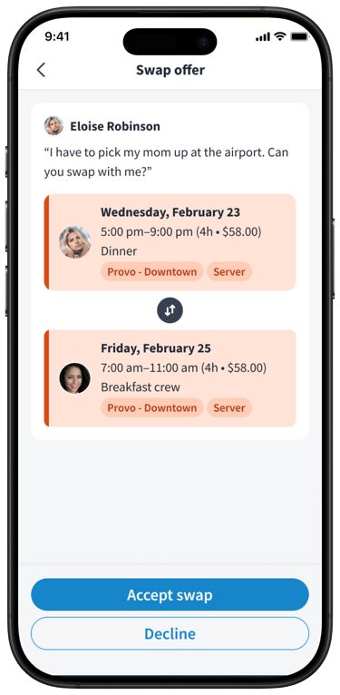 They review the shift details (date, time, role, and location). They can choose Accept swap or Decline.