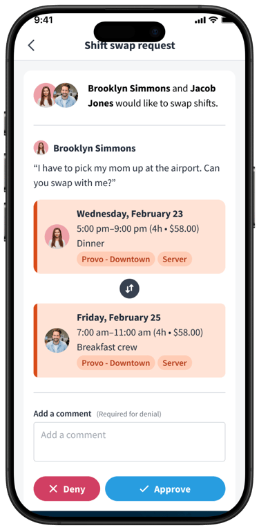 The manager clicks Approve or Deny. If approved, the schedule updates and both employees are notified. If denied, the original assignments remain, and the requesting employee is still responsible for their shift.