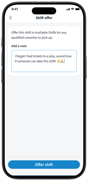 Before offering the shift, the worker enters a note. The shift is marked as Offered and becomes visible to eligible coworkers in an available-shifts list.
