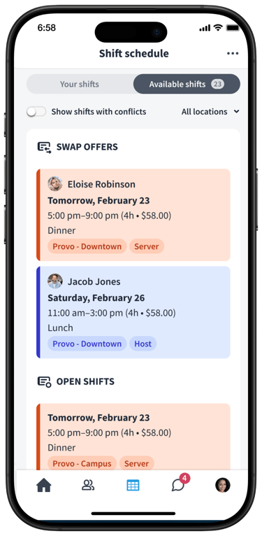 When shift offers are enabled, eligible employees can see which shifts are available to claim. A coworker opens their schedule or Available shifts list. Offered shifts appear with a clear label (for example, “Swap Offers” or “Open shift”).
