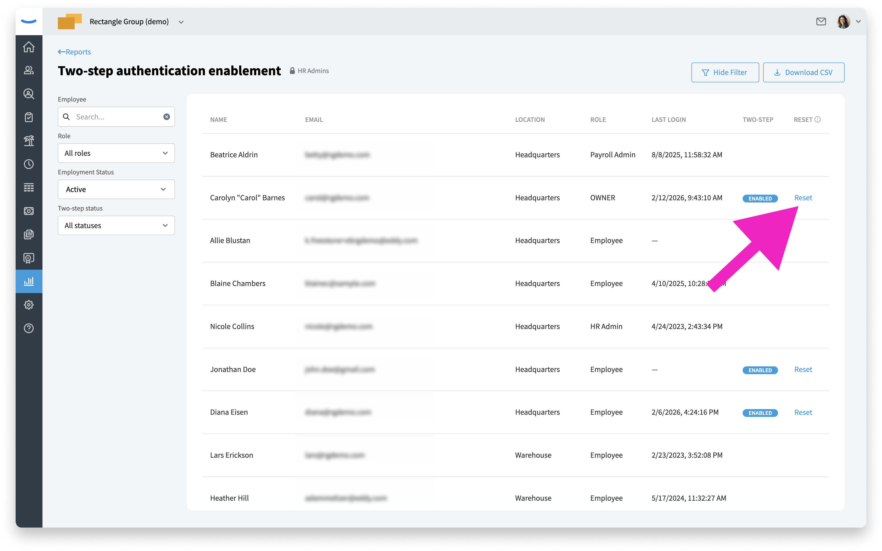 This report shows a list of the last login for each user, and shows if Two-Step Authentication is enabled for that user. If MFA is enabled for a user, the owner role use has a button to reset the MFA, which will remove the requirement for an MFA token on login for that user. If the owner role needs to reset their own MFA, please contact our Support Team.