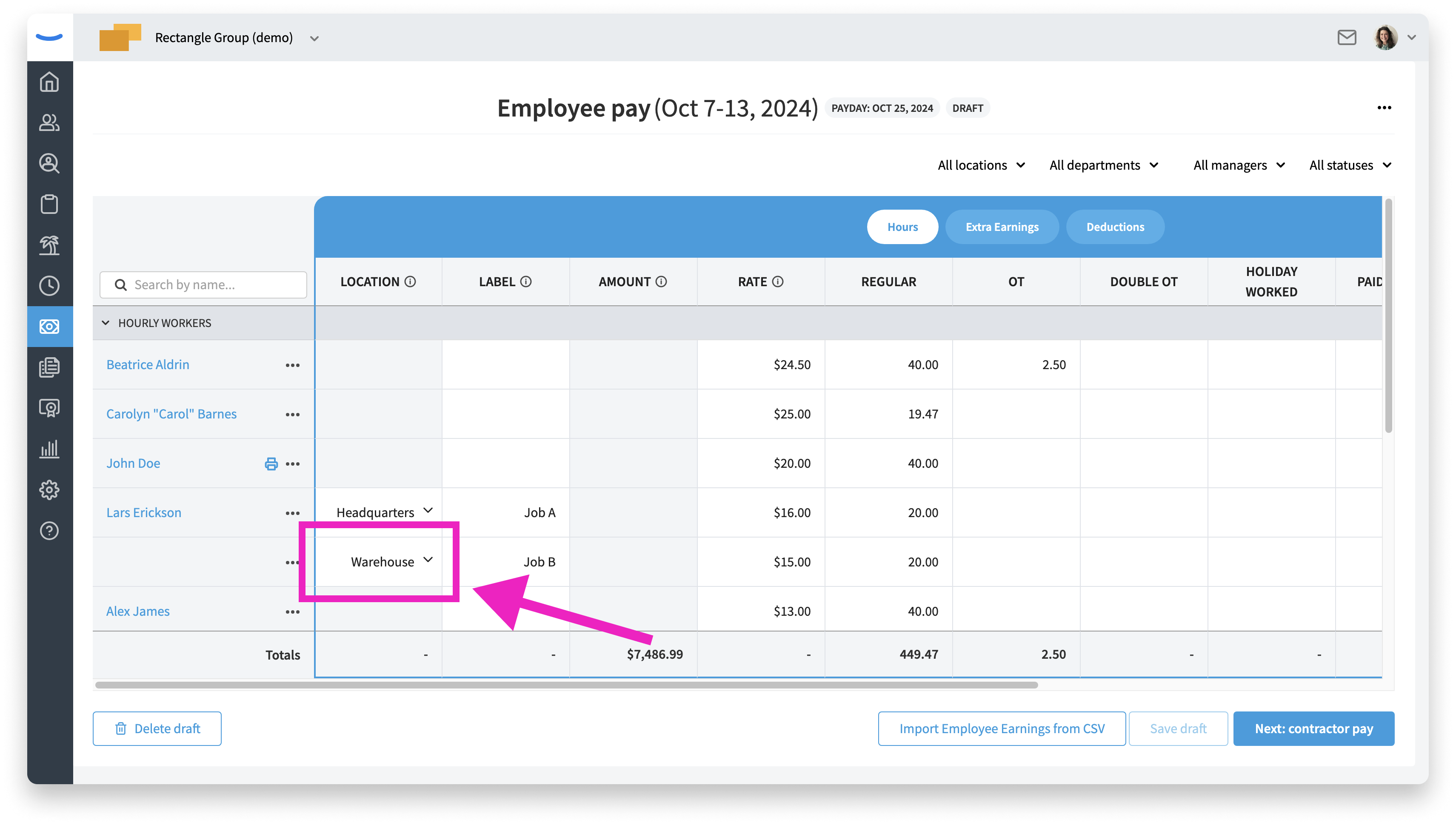 When a new row is added for a worker with multiple work place assignments, we'll show a drop-down menu option for the location column where you can click to select the appropriate work location for the payroll earnings.